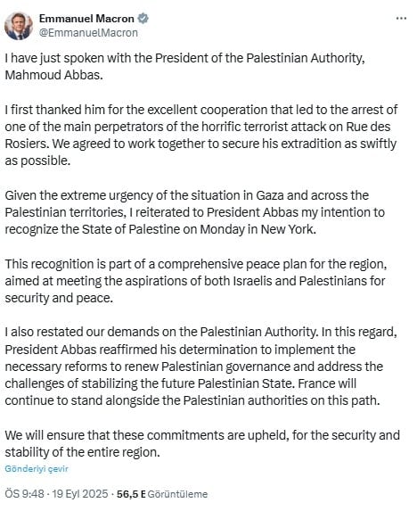 Gazze’de ve Filistin topraklarındaki durumun son derece acil olduğunu göz önünde bulundurarak, Pazartesi günü New York’ta Başkan Abbas’a Filistin Devleti’ni tanıma niyetimi yineledim.