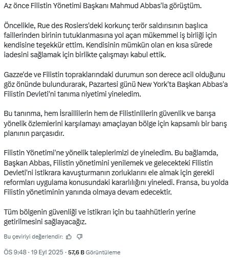 Fransa Cumhurbaşkanı Emanuel Macron sosyal medya hesabından yaptığı paylaşımda şu ifadeleri kullandı: