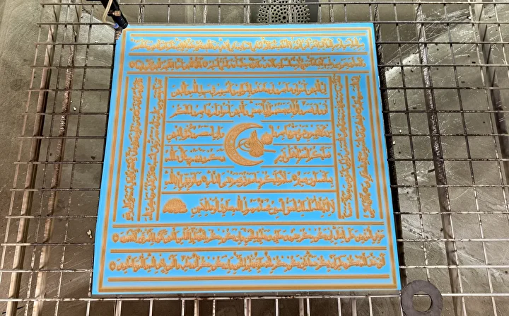 Çalışmayı 38. Ahilik Haftası’na yetiştirdikleri için mutlu olduklarını belirten Erbaş, “En uygun ölçünün 1 metreye 1 metre olacağını değerlendirdik. Bu ürünün üzerinde çok büyük emek var. Görüldüğü gibi normal bir baskı işi değil, tek tek kazıma yapıldı. Kazımadan sonra boyamalar, desen ve renkler için ayrıca çalışma var.” dedi.